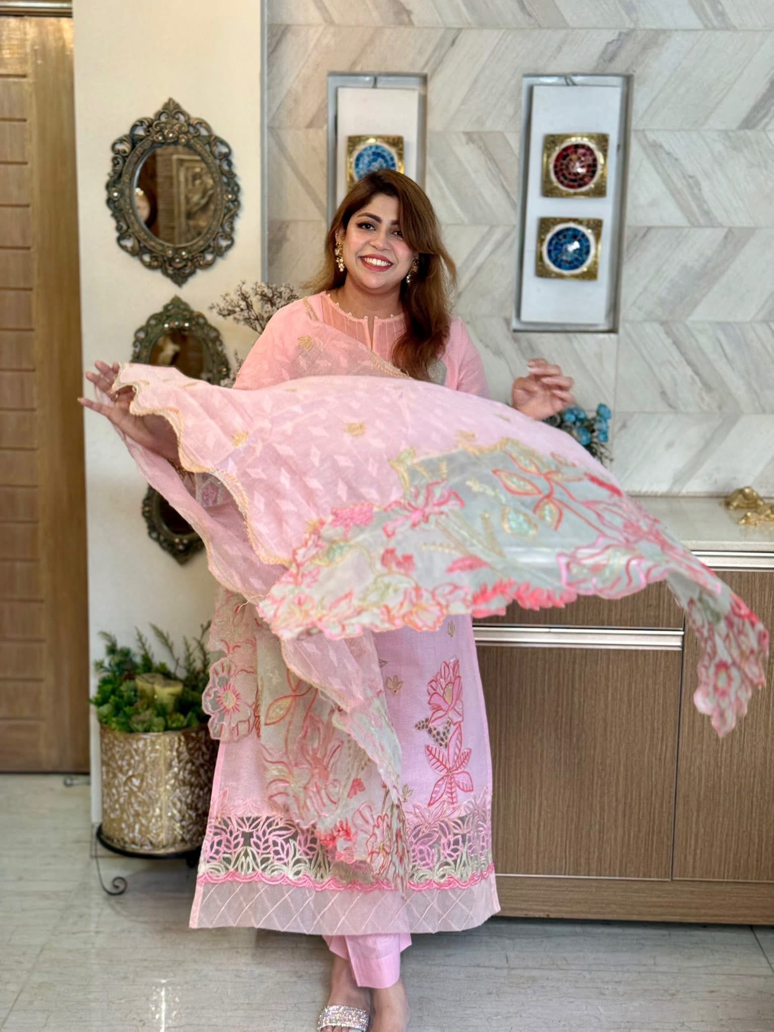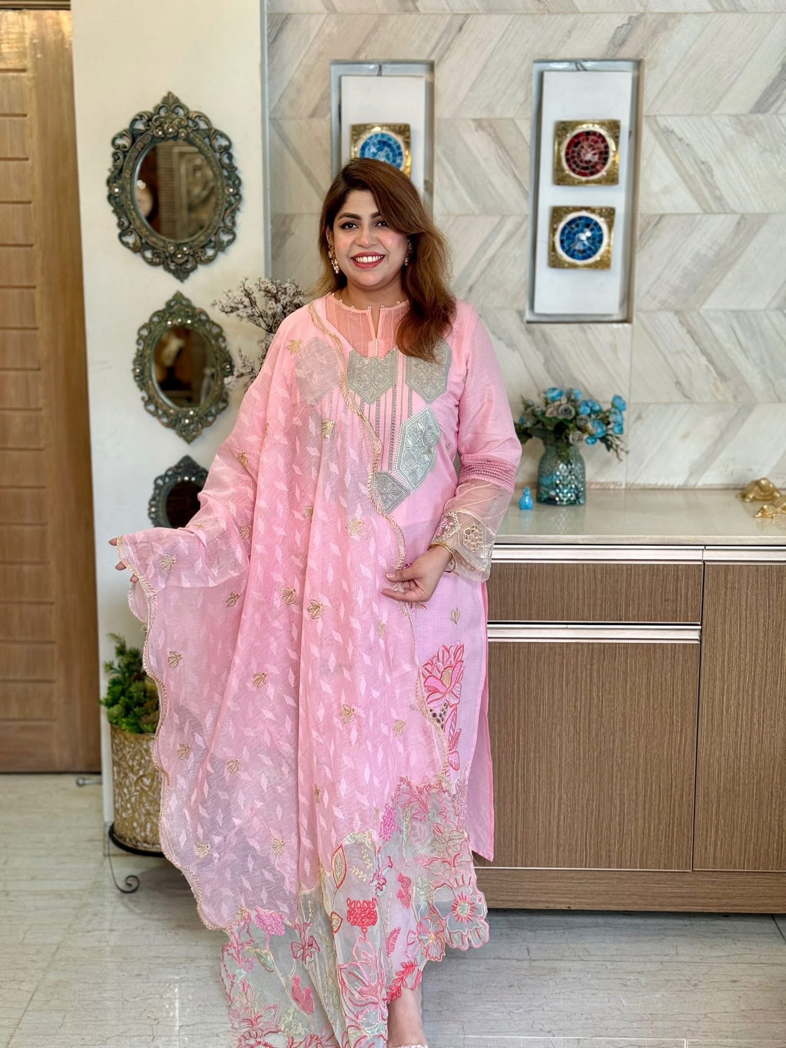 This dress is in a Pink colored finest cotton. It is heavily embroidered all over with pastel tone, hazel and brown terracotta and lots of colour . The dress features all over exclusive embroidery with laser ka details. It has an exclusive daman, also heavily embroidered which is set in organza panel . The sleeves are adorned with floral embroidery and intricate organza panel.