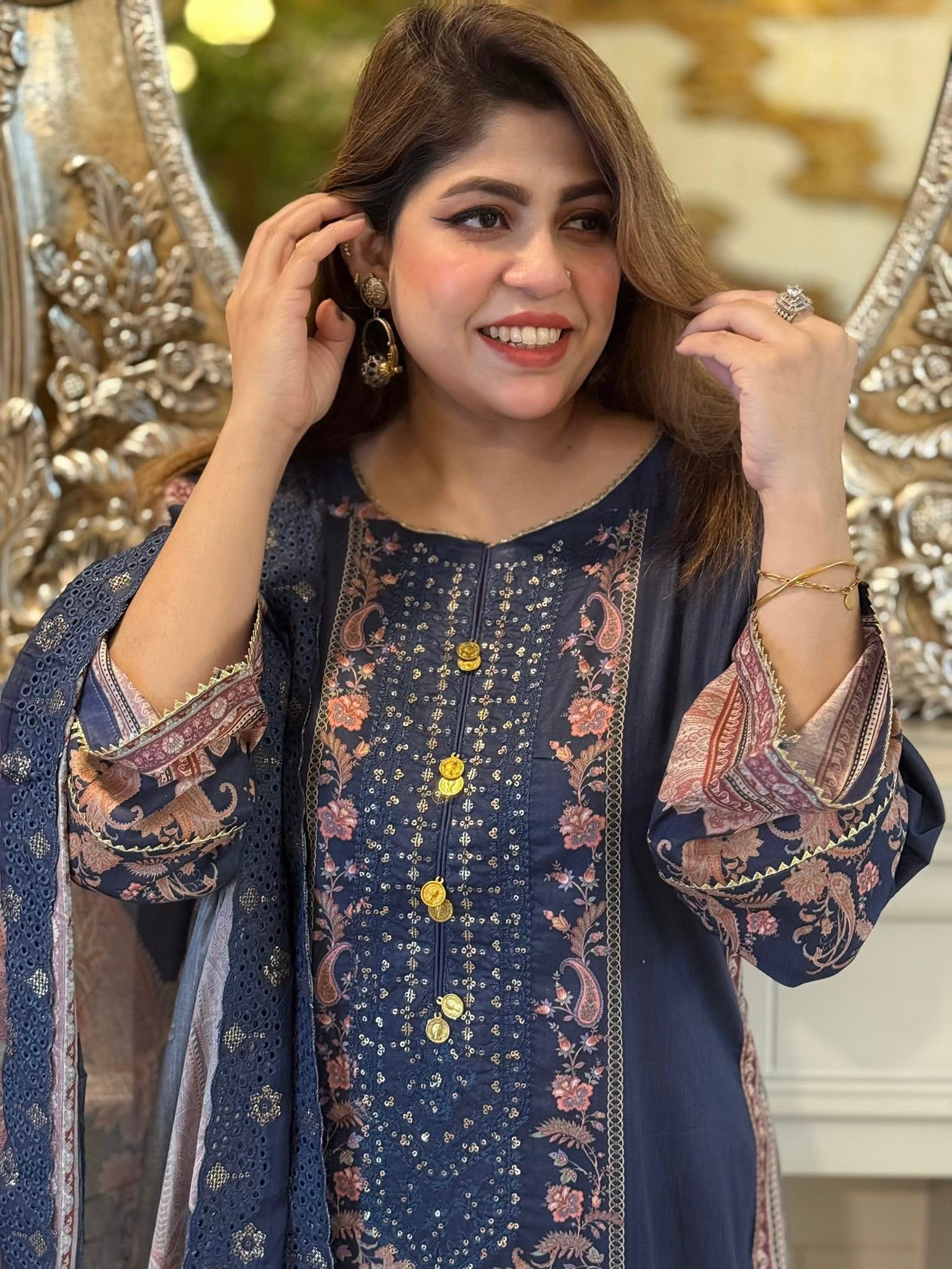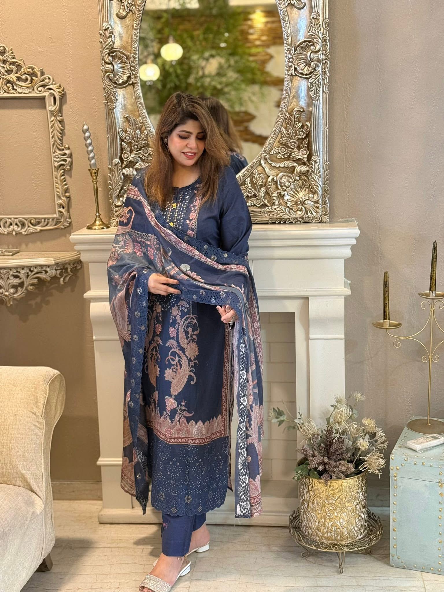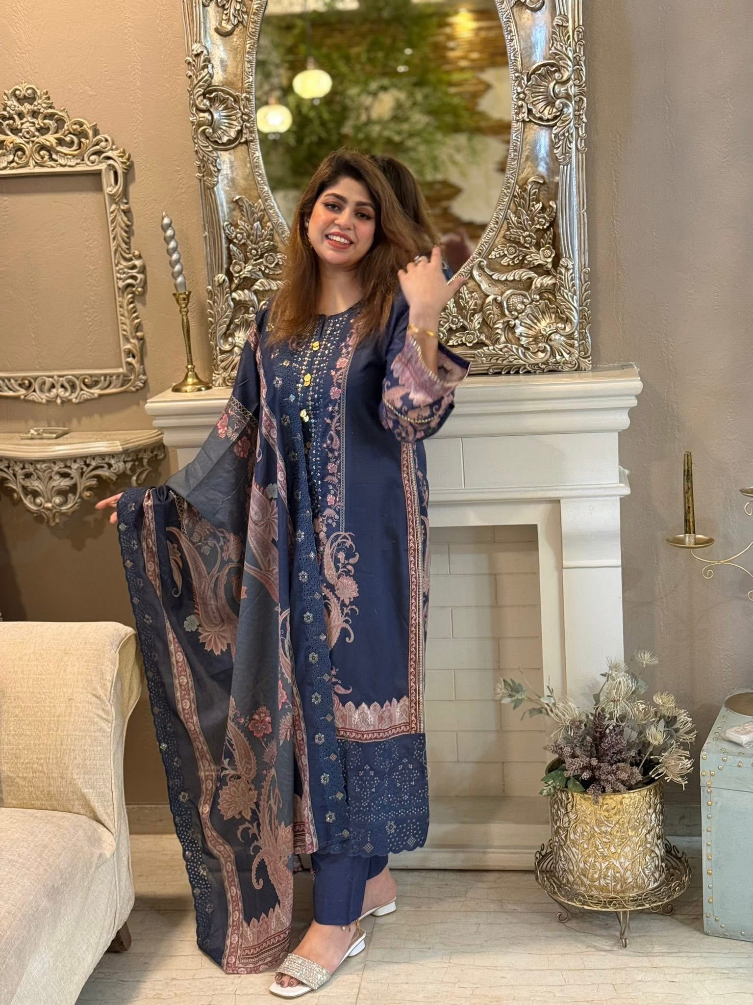 This dress is made from pure cotton in a stunning midnight navy, adorned with a beautiful digital print. The chest is lavishly worked with navy and golden shimmering sequins, creating a rich, eye-catching design. The back is also beautifully digital printed, while the daman is heavily embroidered with navy thread and shimmering sequences.
