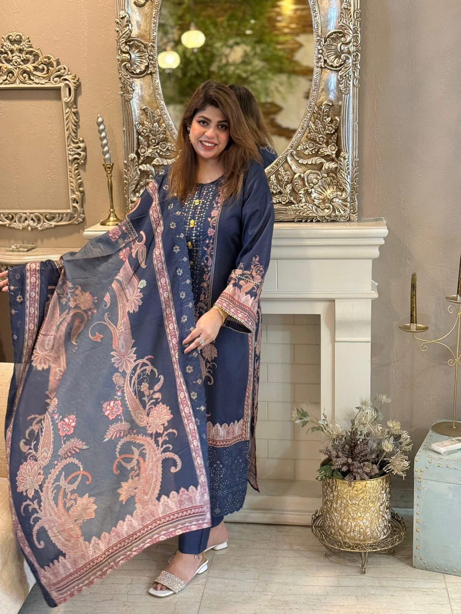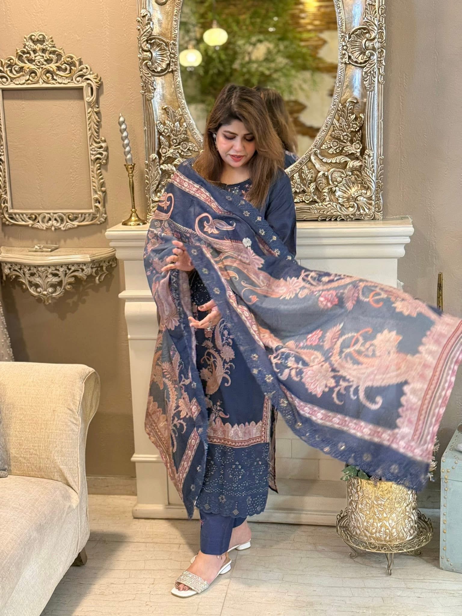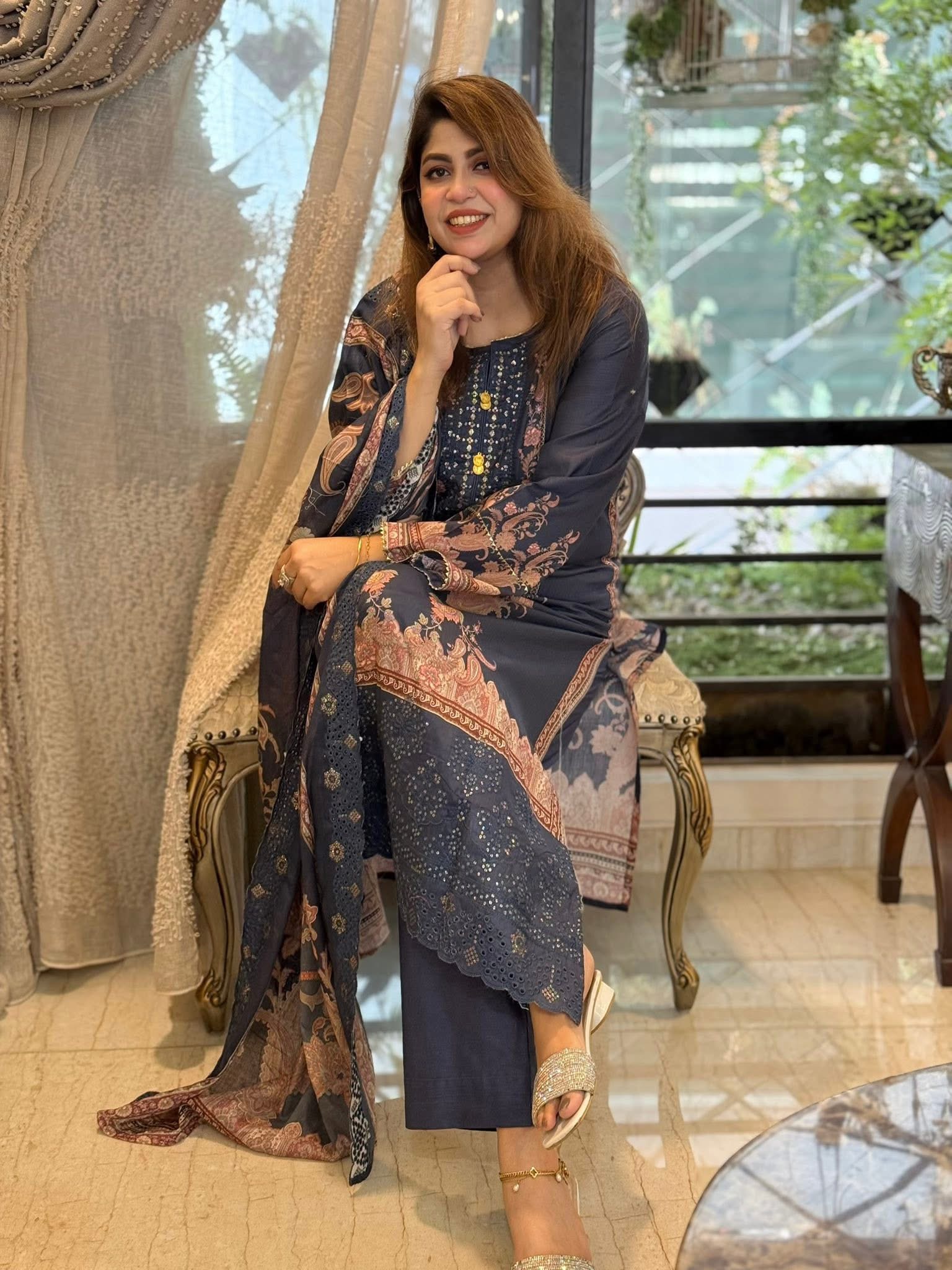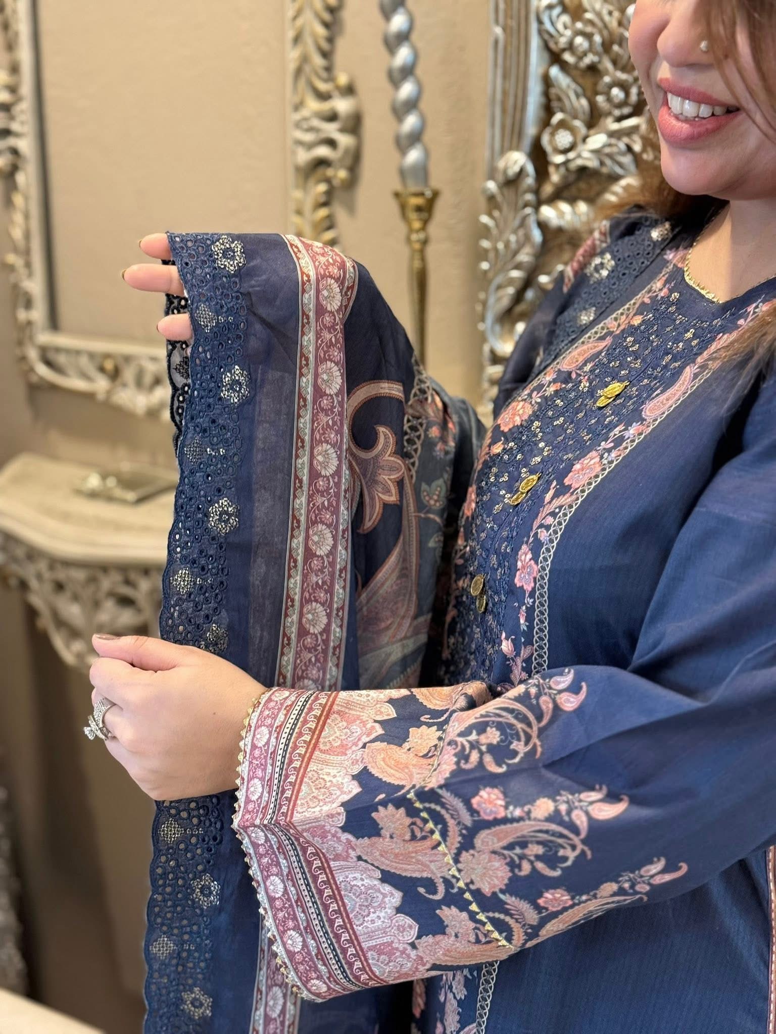 This dress is made from pure cotton in a stunning midnight navy, adorned with a beautiful digital print. The chest is lavishly worked with navy and golden shimmering sequins, creating a rich, eye-catching design. The back is also beautifully digital printed, while the daman is heavily embroidered with navy thread and shimmering sequences.