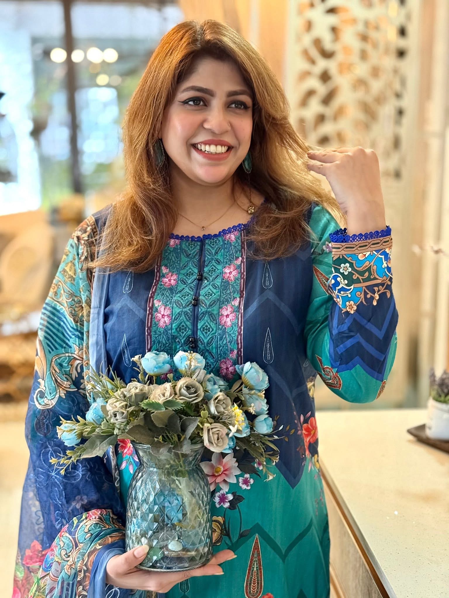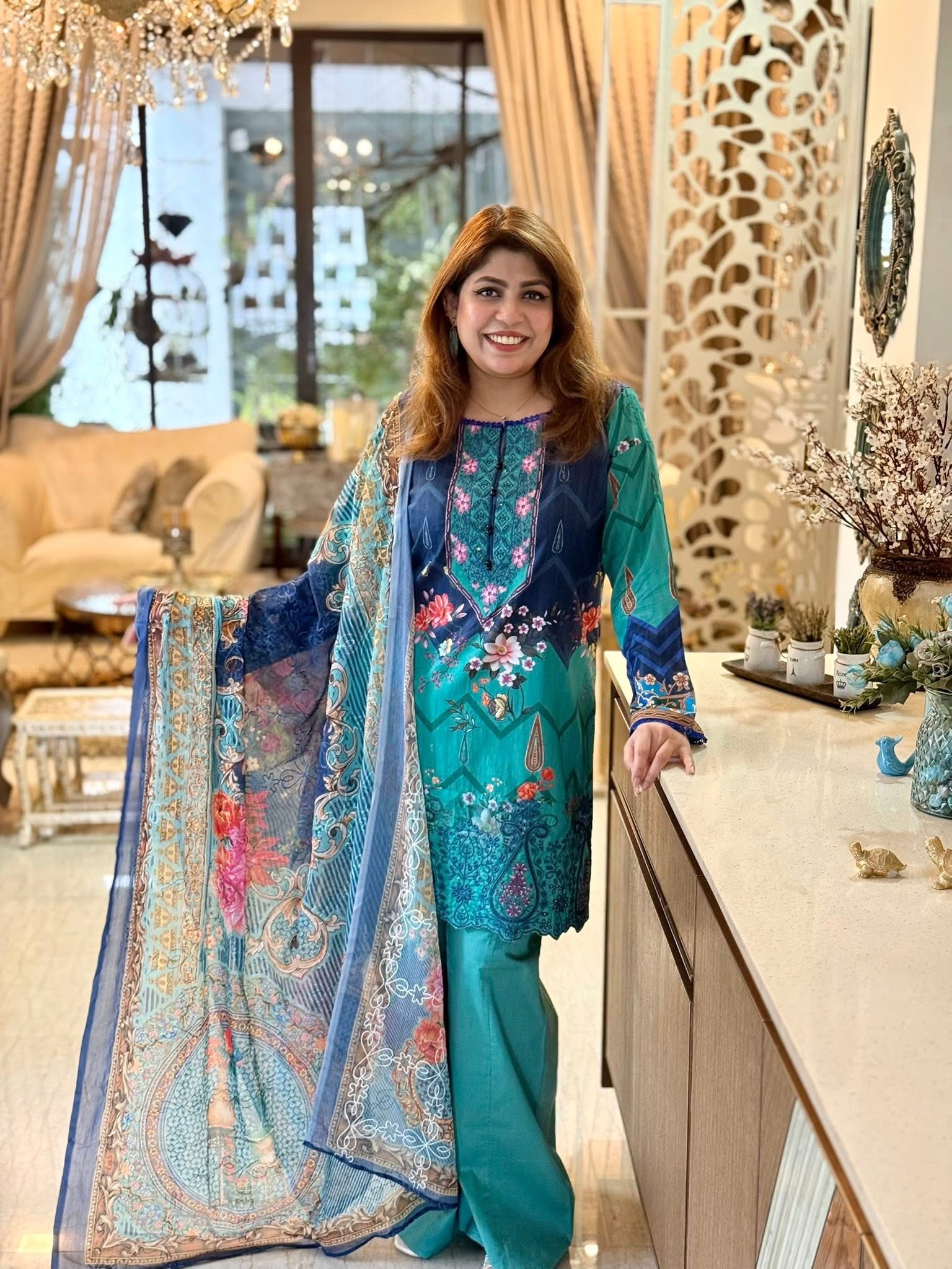 This dress is in dark navy blue with peacock green, all-over beautiful digital print, featuring a vibrant mix of colors. The chest is heavily embroidered with dark navy blue thread, accented with pink, light baby pink, magenta, and sequins. The daman is also heavily embroidered, with delicate cutwork and chikankari details.