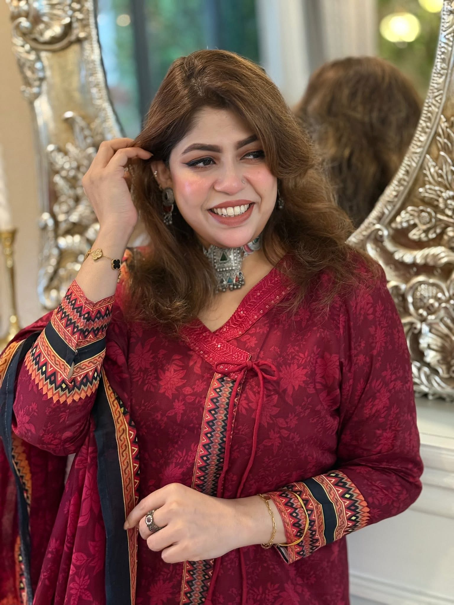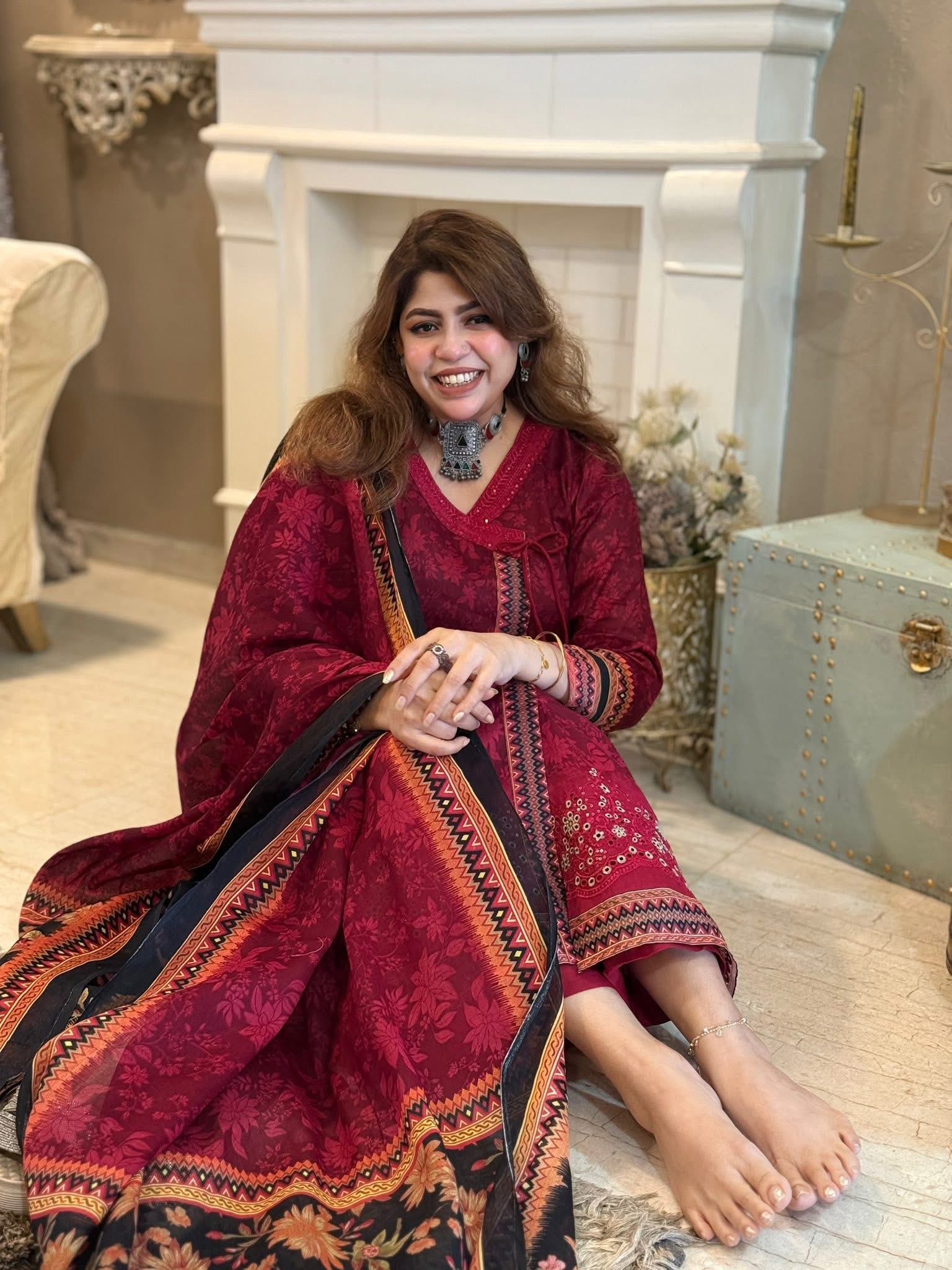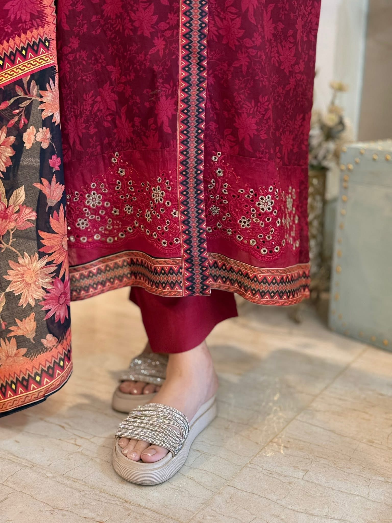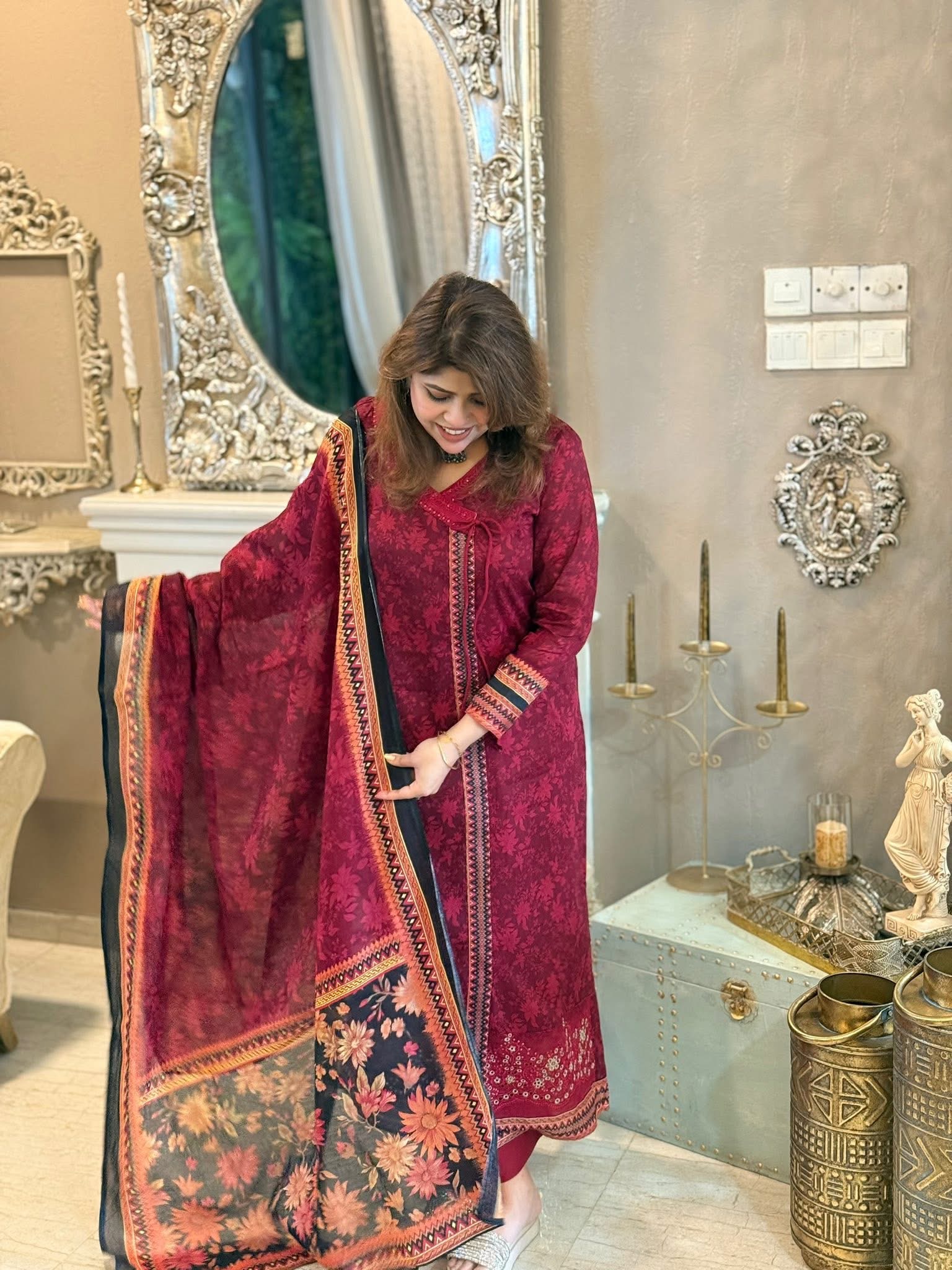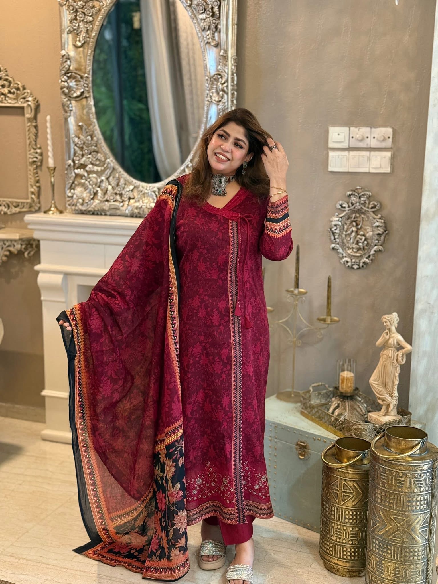 The dupatta is a maroon and black digital print with a floral design.